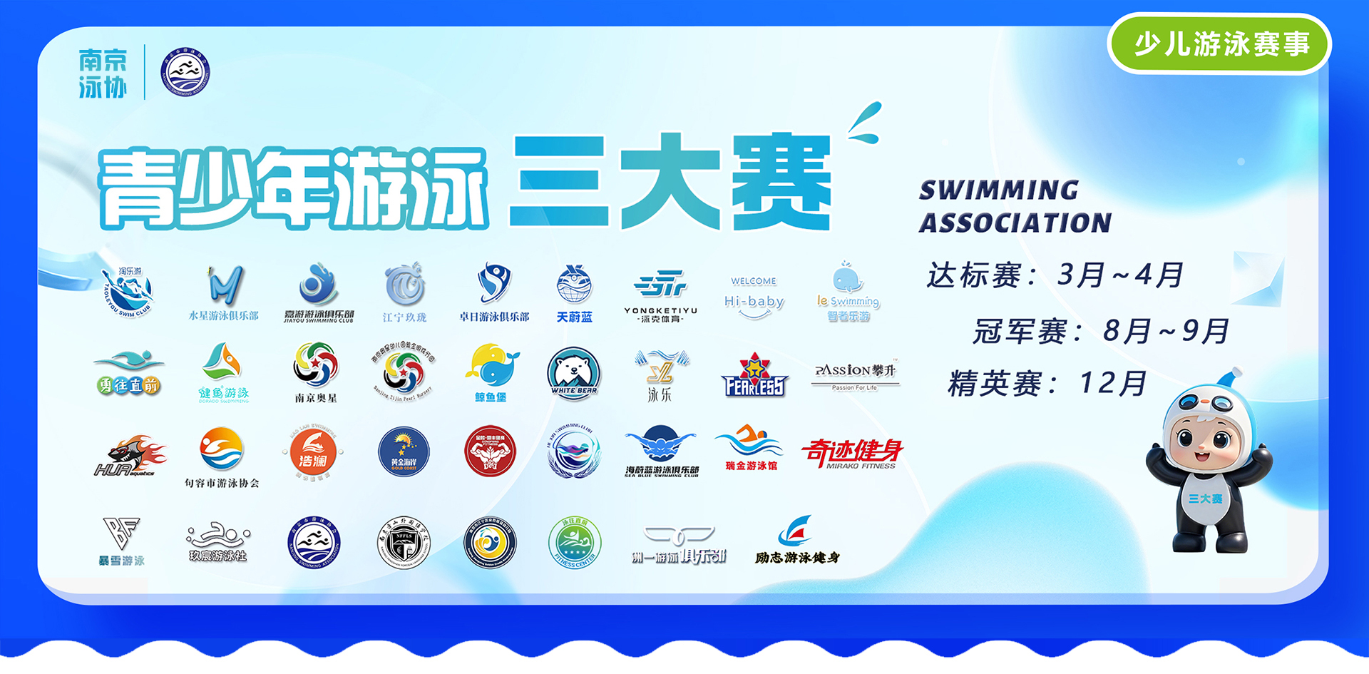 南京市游泳协会每年定期举办青少年游泳三大赛。意在借助阶段性的达标赛、冠军赛、精英赛,